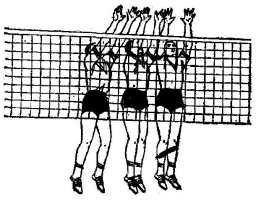 1.移动与起跳:面向对方,贴近球网站立,做好移动前的稍蹲准备。当判断出对方从某个位置扣球时,根据移动距离远近采用相应移动步法,边判断边移动迅速到位。(1)短距离:采用并步移动,(2)较远距离:采用交叉步移动,(3)远距离:采用快速跑步接类似扣球的助跑移动。到位后,迎着对方扣球的助跑路线,两膝弯曲,重心下降,两臂在体侧划小弧经体前用力夹臂向上摆动,带动身体贴网垂直向上跳起。起跳时,应掌握起跳时间。拦一般高球时,应比扣球队员稍晚些起跳。拦远网球时,应在对方击球一瞬间起跳。拦快球时,应与扣球队员同时起跳。