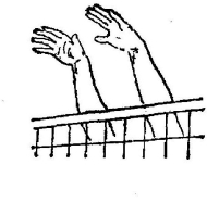 2.空中拦击:起跳后,身体保持收腹状态。两手从额前平行球网上沿向对方伸出,同时两臂平行,两肩尽量上提,以提高拦网高度。手指展开,保持紧张,两手、臂间的距离不得大于球。(图7-34)当手触及球时,迅速紧张屈腕,将球盖向对方场内,当手臂触球时,加大手臂的紧张度,调整方向将球拦入对方场内。