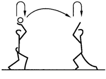 方法:两人迎面站立,正面迎球向上自传(垫)后转身背传(垫)给对方。
