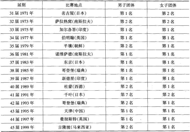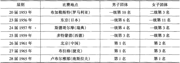 表8-1 中国乒乓球队参加历届世界乒乓球锦标赛团体成绩