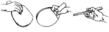 1.直拍握拍(图8-1)。拍前,以食指第二指关节和拇指第一指关节扣拍;拍后,三指自然弯曲贴于拍的1/3上端,这种握拍法称中钳式。