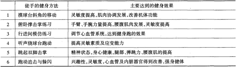 (2)健身效果:这是在有氧条件下进行的一种带模仿动作的健身跑活动,这样能起到调节心血管系统的效果,同时又能体会到乒乓球运动的基本动作。