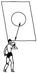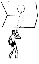 1.练习方法:一人持拍对地击球弹向墙壁,回弹落地后,再挥拍击球向地面,然后再弹到墙壁,连续不断的重复此种动作,同时,根据球回弹的高度和远度,采取移动脚步回击反弹球(图8-12)。