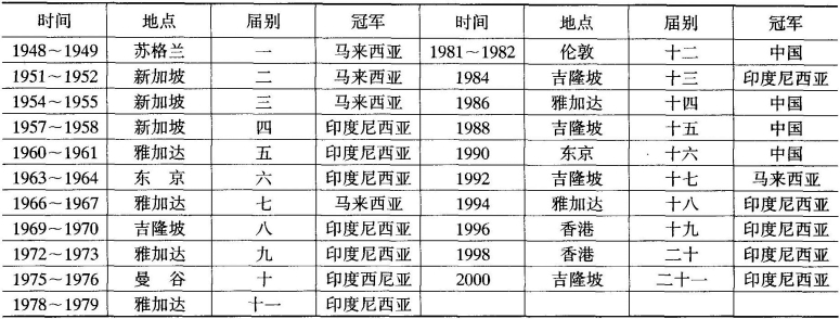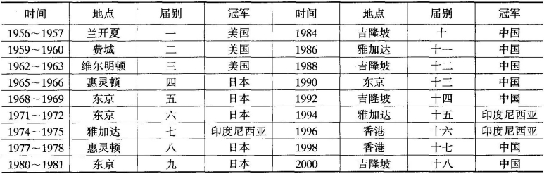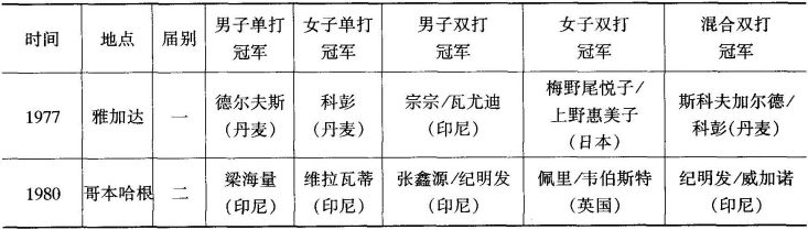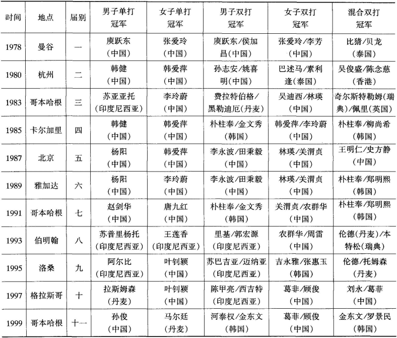 表9-4 世界羽毛球锦标赛(世界羽联主办)冠军榜