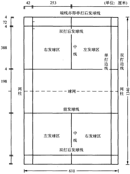 羽毛球场地(图9-1)是在一块长方形的平地上,画上单打和双打合用的场地线,中间悬挂球网,两端网柱高1.55米,网中间距地面1.524米,参加活动者各持一只球拍,共用一只羽毛球进行活动。