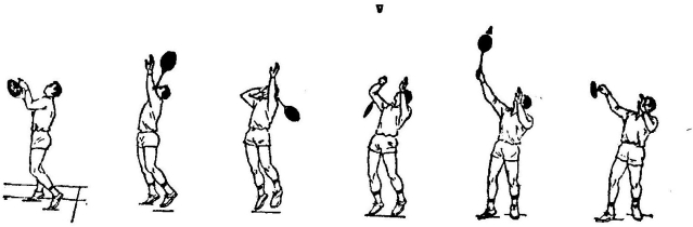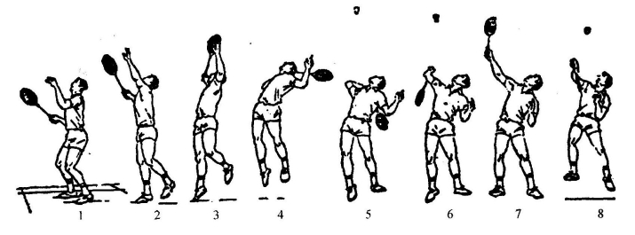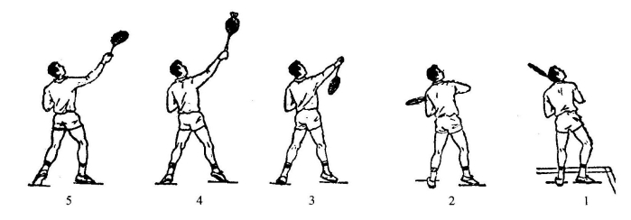 ③击球动作:右腿蹬伸,向右转体约90°,上臂向上伸展,前臂迅速内旋,顺着原来的回环动作继续向前上方挥动,击球点在右肩上方,击球瞬间手臂自然伸直,手腕屈腕发力,中指、无名指和小指抓紧球拍,以正拍面击球托的后下部。