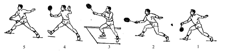 ⑤击球后动作:击球后,身体重心移到左腿上,持拍手自然随惯性向左上方挥动,还原成接球的准备姿势。