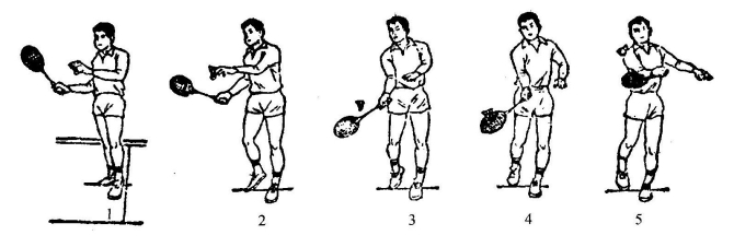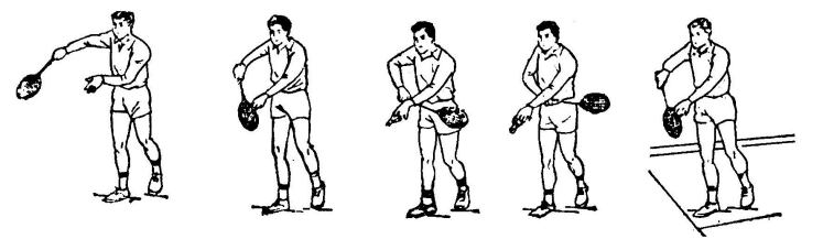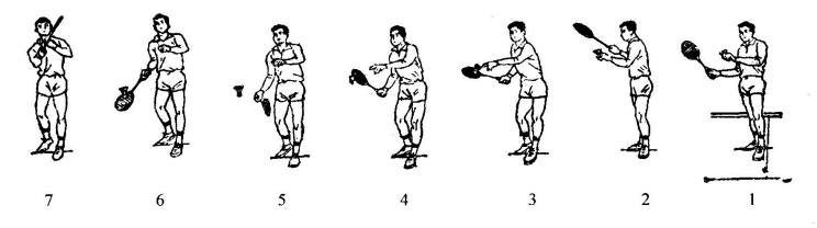 c.击球动作:前臂急速往右侧挥动,从外旋转为内旋,球拍由后伸至伸直闪腕,挥拍抽压击球托底部。