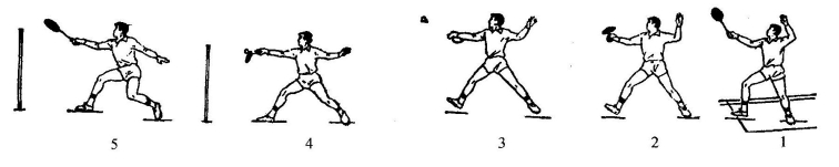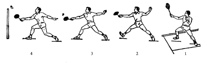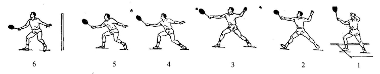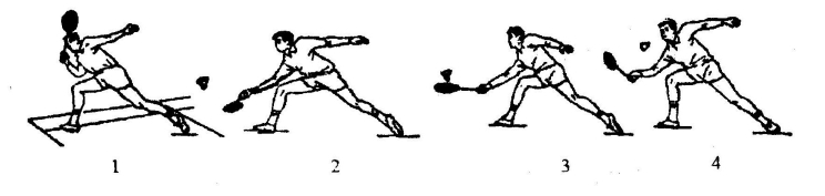 ④击球后动作:右手击球后,随惯性向前下方挥动,同时右脚向前跨步缓冲,还成接球准备姿势。