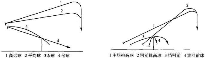 羽毛球的各种挥拍击球技术统称为击球法。它大致可分为后场击球技术、中场击球技术和网前击球技术三大类(图9-9)。
