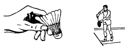 ①准备动作:站在靠近前发球线和中线附近的发球区内,右脚在前,左脚在后,脚尖点地,身体重心在右脚上,面对球网;左手大拇指、食指和中指持球的羽毛,置于腹前腰部以下。右手反手握拍,肘部上抬,使拍框垂于左腰侧,两眼注视对方动向(图9-8)。