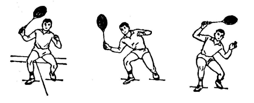 ①准备动作:左脚在前,右脚在后,两脚间距离同肩宽,身体侧对网,重心在右脚上,左手自然上举,右手正手握拍,屈臂举于右侧,眼睛注视来球。