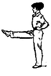 动作说明:右脚向前半步,右腿支撑,左脚勾紧脚尖向异侧耳际猛踢。两眼向前平视(图10-35)。练习时左右腿交替进行。