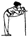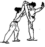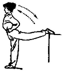 手扶肋木或一定高度的物体,并步站立。左腿支撑,由同伴托起右腿从身后向上举,挺膝,脚尖绷直,上体略前俯。当同伴向后上方振腿时,上体后仰(图10-30)。也可由同伴用肩扛大腿做后搬动作。练习时,左右交替进行。