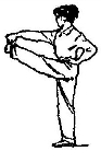 右腿屈膝提起,右手经小腿内侧向下托住脚跟。然后将右腿向上方搬起,左臂上举亮掌(图10-28)。也可由同伴托住脚跟向侧搬腿(图10-29)。