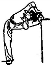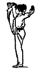 侧对肋木或一定高度的物体,右腿支撑,脚尖稍外撇。左腿举起,脚跟搁在肋木上,脚尖勾起,踝关节紧屈。右臂屈肘上举,左掌附于右胸前。两腿伸直,立腰、开髋,上体向左侧压振(图10-20),练习时,左右交替进行。