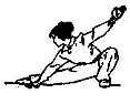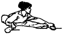 两脚左右开立,右腿屈膝全蹲,全脚着地,左腿挺膝伸直,脚尖里扣,然后两手分别抓握两脚外侧,成左仆步(图10-23),接着右脚蹬地,右腿伸膝,重心左移,左膝弯屈,转成右仆步(图10-24)。练习时,左右仆步可交替进行。