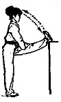面对肋木或一定高度的物体,并步站立。左腿提起,脚跟放在肋木上,脚尖勾起,踝关节屈紧,两手扶按膝上。两腿伸直,立腰,收髋,上体前屈,并向前、向下做压振动作(图10-18)。练习时,左右腿交替进行。