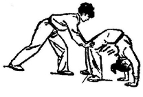 2.下腰时可由同伴托腰保护,下腰后同伴可缓缓后推其膝部,以增加下腰效果(图10-61)。