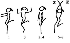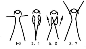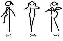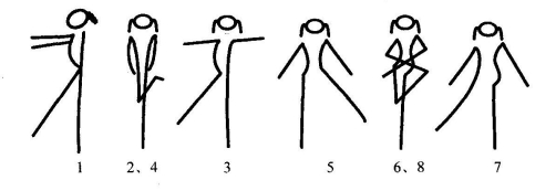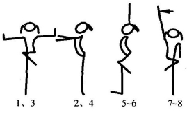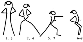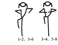 2拍:还原;3~4拍同1~2拍,但方向相反;5~8拍:踏步4次,同时两臂自然摆动(图11-54)。