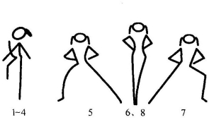 第一个8拍:1~4拍:原地踏步,两手自然摆臂;5拍:两手叉腰,左脚向左一步成左弓步,右脚侧点地;6拍:左腿收回并于右腿直立;7拍:两手叉腰,右脚向右一步成右弓步,左脚侧点地;8拍同6拍,但动作相反(图11-43)。