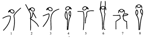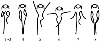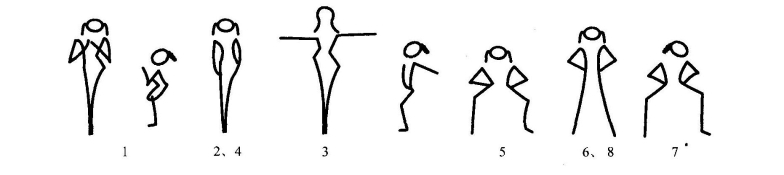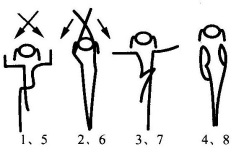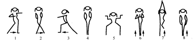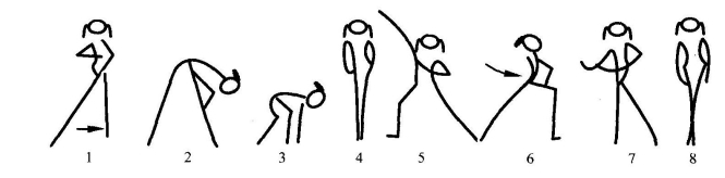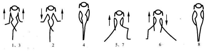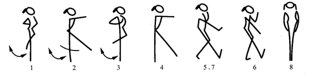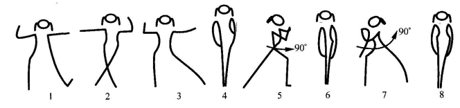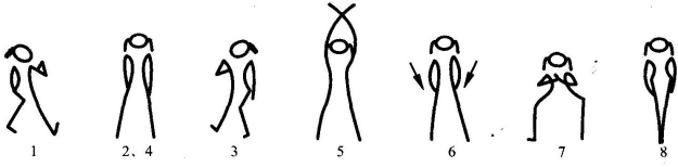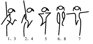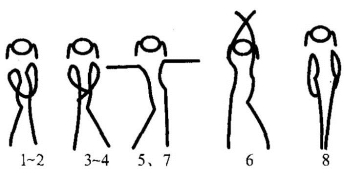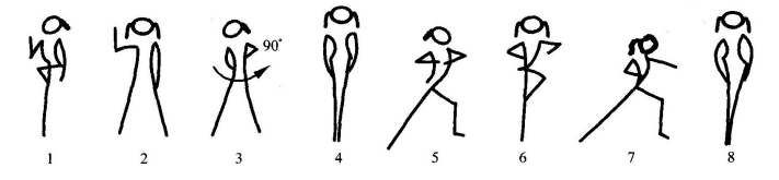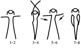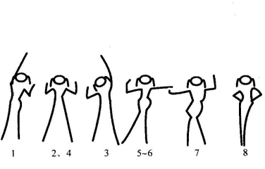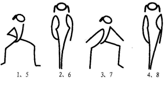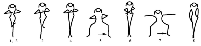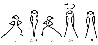 第三、四个8拍同第一、二个8拍,最后一拍成直立。