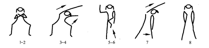 8拍:右脚小跳一次收回直立,同时两臂经体侧收回。