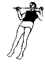 该练习与躬身提拉基本相同,但身体的姿势和采用的器械不同。需要两把结实的椅子,椅子背对背放,相距1.5米左右,把一根直径4~5厘米粗的结实的棍子横放在椅背上。两手正握棍子,掌心向足,两手比肩宽20厘米左右。屈臂引体向上,至下颌触棍。然后放下,至手臂伸直(图12-75)。整个过程中保持身体伸直,动作缓慢,足后跟着地。该举重发展肱二头肌、上背肌肉(菱形肌和斜方肌)及背阔肌。当能完成3组,每组重复25次时,可在胸前加一重物进行练习。