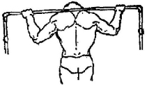这种练习需要的唯一器械是高单杠,练习的作用与背阔肌下拉练习相同。可以正握(掌心向前),也可以反握(掌心向后),反握做引体向上时,肌肉工作的条件较有利。采用宽握还可使背阔肌得到更完全的锻炼(图12-79)。假如每组不能重复做8~10次,引体时可把脚放在凳子上,减轻动作负担。