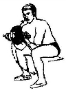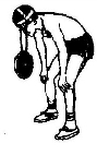 这种举重也要戴上头铠。站立,体前屈,腿微屈,手臂伸直用手撑在膝上,以固定上体(图12-78)。杠铃片悬在头前,交替屈颈和伸颈。这种举重发展颈后肌肉。