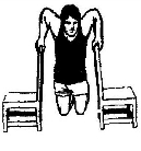 该练习与双杠屈臂撑起相同,可用两张结实的椅子代替双杠,椅子背对背放,相距约肩宽(图12-74)。从屈膝伸臂支撑开始,屈臂放下身体,使肩前部放至椅背,然后伸臂撑起至开始位置。臂屈伸时,保持躯干垂直。开始练习时,身体向下的幅度可以小些,随着力量的增大,逐渐增大动作的幅度。该练习发展手臂后部肌肉(肱三头肌)、肩前部肌肉(三角肌前部肌纤维)和胸肌。