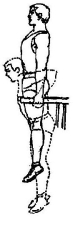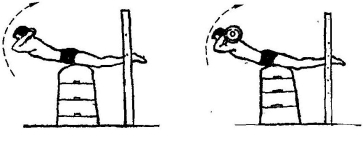 在双杠间直臂支持身体,屈肘,身体向下,直至上臂低于肘关节(图12-80)。从这位置开始,伸直手臂,身体不要摆动。这种撑起主要发展肱三头肌、三角肌前部肌纤维和胸肌。锻炼一段时间,力量增大以后,就可以负重进行练习,如穿铁靴、腿上捆沙袋或穿铁背心。