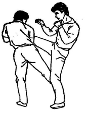 实战势开始,右腿直立支撑,左腿屈膝向上提起,伸髋、挺膝,左脚直线向前蹬出,脚尖朝上,力达脚底或前脚掌;上体正直或微后仰,两拳不变(图13-19)。