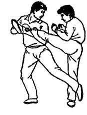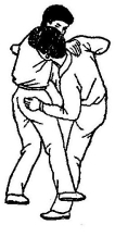 实战势开始,左脚进步,右脚再跟进一步(或右脚上步、左脚跟进),屈膝半蹲,两手抱住对手双腿后,身体直立,视具体情况,可灵活采用抱腿侧摔或抱腿踢腿摔,也可抱单腿后手别摔(图13-27)。