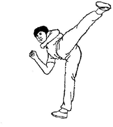 重心前移,左腿直立支撑。上体微左转,左脚跟里转;右腿合胯屈膝上提,右脚经外向斜上、向里横踢,绷脚面,小指外侧朝上,力达脚背后端,两手收回护于胸前,目视右脚(图13-24)。