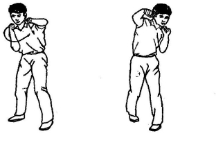 ②翻肘过早,出现甩拳。纠正时,请同伴帮助,一手拉拳,一手按肘,改正翻肘过早的错误。