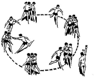全体游戏者一路(二路)纵队成圆形慢跑(图14-2),游戏的组织者喊“4”,游戏者马上4人一组互相抱团,叫“3”,游戏者马上3人一组抱团,没找到同伴的则要受罚。
