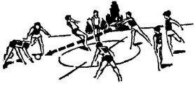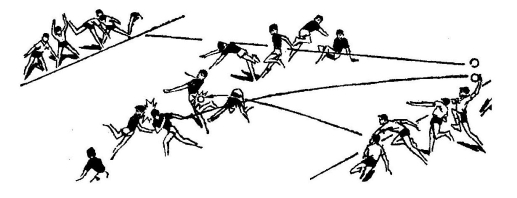 2.此游戏也可改为“冲过火力网”,即“游击队员”机智地躲避“敌人”的打击,一路纵队冲过火力区,在规定时间内,看哪组通过的人多。