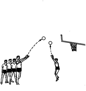 将游戏者分成若干组(以10人为一组),每组选定一人手持篮球站在篮下,其余人成纵队站在罚球线后,排头手持篮球准备投篮(图14-21)。游戏开始,当排头投篮,球出手在空中飞向球篮时,站在篮下的人及时抛球撞击来球。若击中,两人则互相交换,游戏继续进行。若未能击中,投篮人依次轮转进行投篮。
