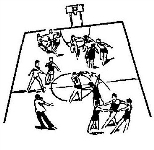将游戏者分成人数相等的两个队,分散在篮球场内(图14-19)。游戏开始,各队先出一人在中圈跳球,得球的人便可掷击对方。被击中者必须原地不动,即为被“点穴”,双方都可在场内跑动抢球和掷击,被“点穴”者如果能在原地获得球,便为被“解穴”,可继续参加游戏,在规定时间内,被点穴人数少的队为胜。