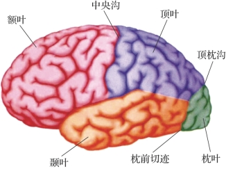 较大的脑沟和脑回标志着大脑皮层向脑叶的分裂。根据大脑解剖学分区,大脑两个半球主要分为4个叶:额叶(frontal lobe)、顶叶(parietal lobe)、颞叶(temporal lobe)和枕叶(occipital lobe)(图2.2)。如果将边缘系统称为边缘叶,就是5个叶。这些脑区的名字来自对应颅骨的解剖位置。额叶为半球的嘴侧区,由中央沟将其与顶叶分开。颞叶在外侧裂下方后界,以外侧沟与额、顶叶分界,后面以顶枕裂与枕前切迹连线与枕叶分界。顶叶前界为中央沟,以顶枕沟及枕前切迹的连线与枕叶分界。左右半球由大脑纵裂隔开,大脑纵裂从脑的嘴侧延伸至前脑尾侧。