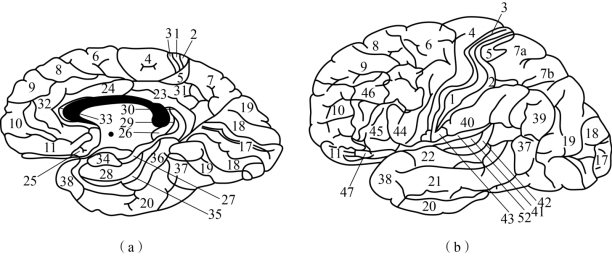 图2.3 大脑半球的背外侧面和内侧面示Brodm ann分区(摘自《神经解剖学》[3])
