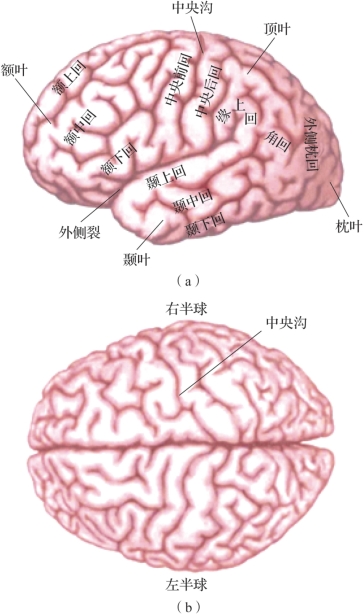 (a)人类左侧大脑半球的外侧面;(b)人类大脑皮质的俯视图(背面观)