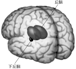 下丘脑位于丘脑下方,包括位于第三脑室底部的一些神经核团及神经束,通过垂体将神经系统与内分泌系统连接起来。下丘脑可以合成和分泌某些神经激素(又称释放激素或下丘脑激素),这些激素反过来刺激或抑制垂体激素的分泌。释放激素产生于下丘脑核,沿着轴突运输到正中隆起或垂体后叶,根据人体需要储存和释放激素。此外,下丘脑还负责自主神经系统的其他功能,参与调动机体应激反应。例如,当人受到惊吓时,下丘脑协调躯体本能的应激反应,调节自主神经系统,促使心率上升、骨骼肌供血增加。而在休息时,下丘脑调节自主神经系统,在确保脑的营养基础上增加肠胃蠕动,促使血液进入消化系统。此外,下丘脑还具有控制体温、饥饱、依恋行为、口渴、睡眠和调节昼夜节律等功能。