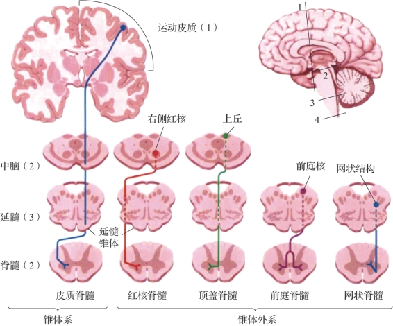 图3.6 大脑通过锥体和锥体外系支配脊髓(摘自《认知神经科学:关于心智的生物学》[1])
