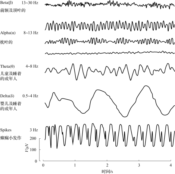 头皮EEG活动可以显示各种频率的振荡,这些振荡具有一定的特征频率范围和空间分布,与脑功能的不同状态相关联。按照周期长短或频率高低可以将脑电信号分为以下几种节律(图4.1)。