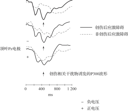 大多数关于创伤后应激障碍(post-traumatic stress disorder,PTSD)的研究都报告了P300的异常,与正常人相比,PTSD患者对创伤相关图形P300成分振幅较大,如图4.7所示,P300振幅增加被认为反映了对威胁刺激的注意偏向,这为PTSD的认知加工损伤机制提供了证据。