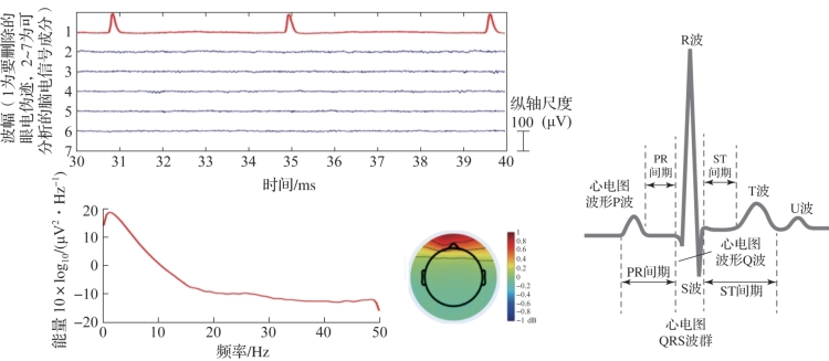 (5)删除伪迹。脑电信号干扰源主要分为两类:一类是体外干扰,如交流电源和环境中的电磁干扰;一类是体内干扰,如眨眼、心电、呼吸、肌电等。几种噪声的基本特征如下(图4.9):①眼电,由眼动所产生的眼电信号是最常见的伪迹,几乎所有被试都会在前额部分导联产生与眼球活动节律一致的伪迹,眼电信号主要包括水平眼电与垂直眼电,在脑地形图上呈现前额叶集中分布,同时时域波形的节律性与幅值远大于100μV,频域能量主要体现为0~20 Hz范围内的平滑下降。②肌电,由于被试会不自觉地进行吞咽等动作,由此引起的肌电信号会对脑电信号产生影响,一般情况下在脑地形图中肌电成分主要表现为集中在颞叶的高能量,其频率在10~2 000 Hz,波形幅值位于10μV~15 mV之间。③心电,在周围环境安静的情况下,可以明显地感受到心跳,甚至听到心跳的声音,因此心电波幅较大,可达数毫伏,但由于心脏距离大脑较远,长距离传输使得脑电电极记录到的心电信号较为微弱,需要注意将其分离。心电信号表现为时域中的QPRS波特征。④工频干扰,由频率相对固定的电力系统所引起,我国的供电电压固定工作频率为50 Hz,在频谱中呈现为50 Hz处的尖峰脉冲。
