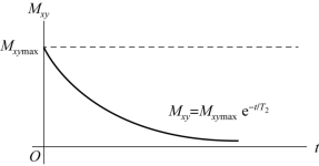 这里T2是横向弛豫速率的特征时间。类比上文对Mz的求解可知Mxy=Mxymax e。其中Mxymax是横向弛豫开始时刻横向磁化磁化强度Mxy的最大幅度。如果是一90°射频脉冲进行激励,那么Mxymax=M0。图5.7是Mxy与时间的关系曲线。