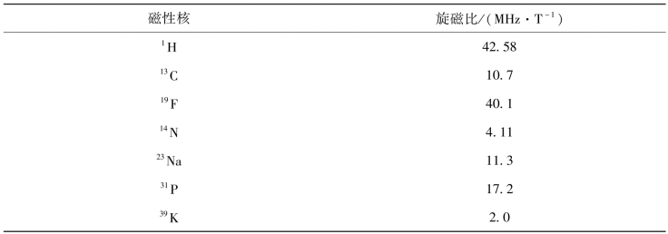 由于中子和质子的自旋量子数都等于1/2,因而所有元素的原子核按它们的自旋量子数,分为零、半整数和整数三类。如果质子数和中子数都为偶数,则原子核的质量数必然是偶数,这类原子核的自旋量子数ћ=0,其核磁矩也为零。这类原子核不和外磁场发生相互作用,而其余的原子核一般都有自旋,因而也都有核磁矩,可以用核磁共振(nuclear magnetic resonance,NMR)技术进行研究。体内氢核1 H的含量最为丰富,对核磁共振成像最为灵敏,现在医用磁共振成像主要采用质子成像。人体内自由水占人体重量的65%~70%,自由水和脂肪中的质子都可以用于磁共振成像。用于描述万高斯场强(Tesla,T)下自旋核共振频率的参数称为旋磁比,用γ表示,单位为MHz/T。除了H元素之外,还有一些元素像是13 C、39 K等,由于其特殊性质也会在其他磁共振研究中使用。表5.1为人体内主要原子核的旋磁比。